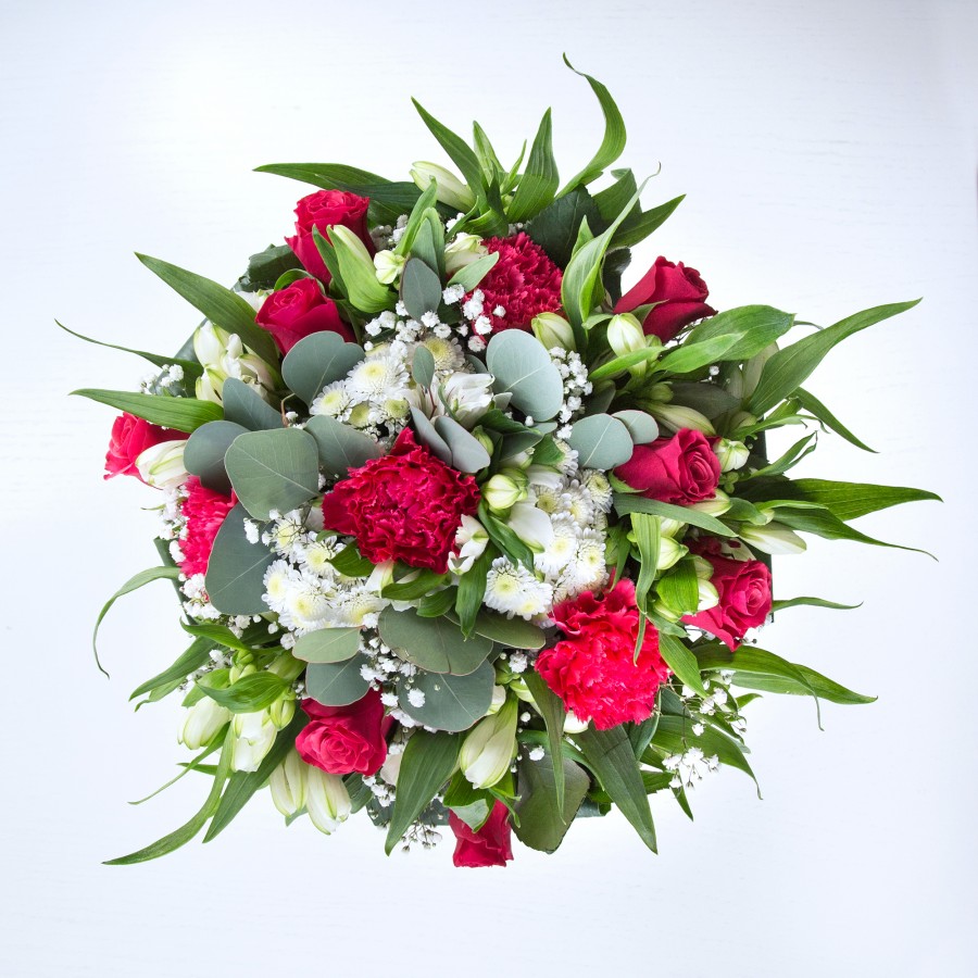 Admire the sophistication of our White & Red Bouquet. This elegant arrangement combines red roses and white chrysanthemums with gypsophila and carnations, creating a harmonious and luxurious display.