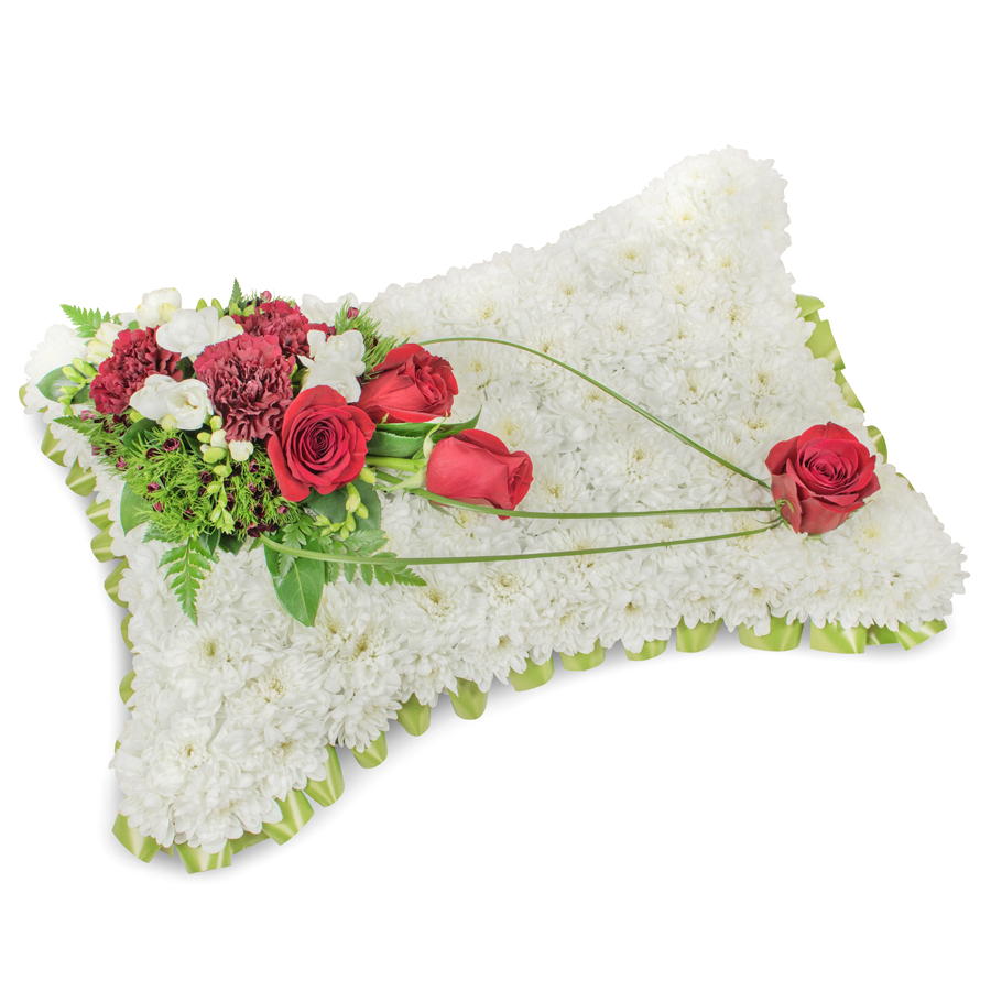 Show your compassion with our luxurious sympathy flower arrangement. This exquisite bouquet showcases white chrysanthemums, elegant red roses, sweet white freesias, and rich dark red carnations, enhanced by dianthus and bear grass for a distinctive design.